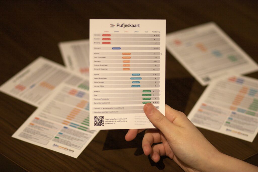 Pufjeskaart brengt inhalatiemedicijnen voor zorgverleners in kaart, zowel online als op papier. Per werkingsprofiel staan de belangrijkste aƫrosolen, poederinhalators en vernevelvoeistoffen uitgesplitst. Dit helpt zorgprofessionals om pufjes uit elkaar te houden.